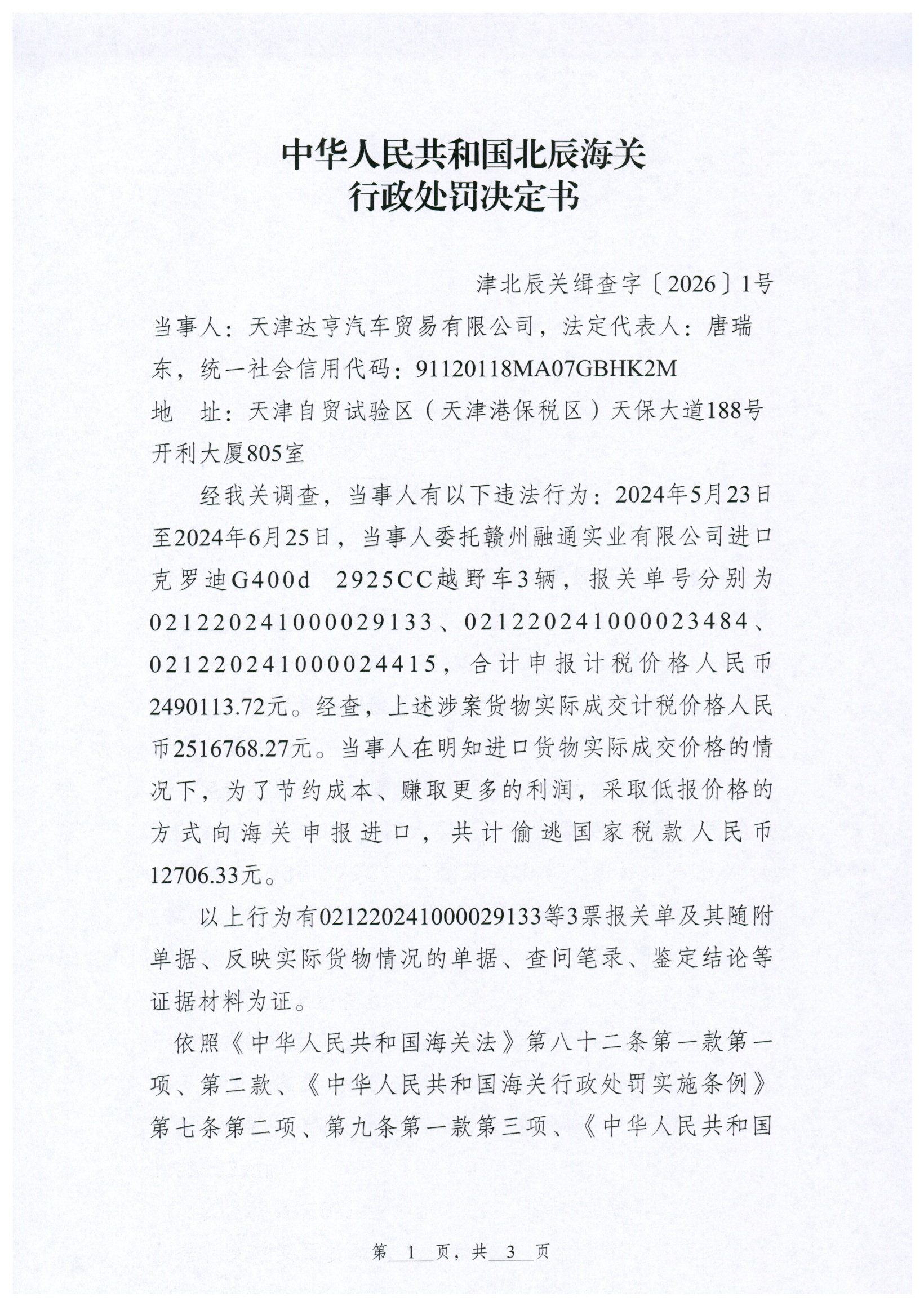 中华人民共和国北辰海关关于对天津达亨汽车贸易有限公司的行政处罚决定书(津北辰关缉查字〔2026〕1号).xlsx