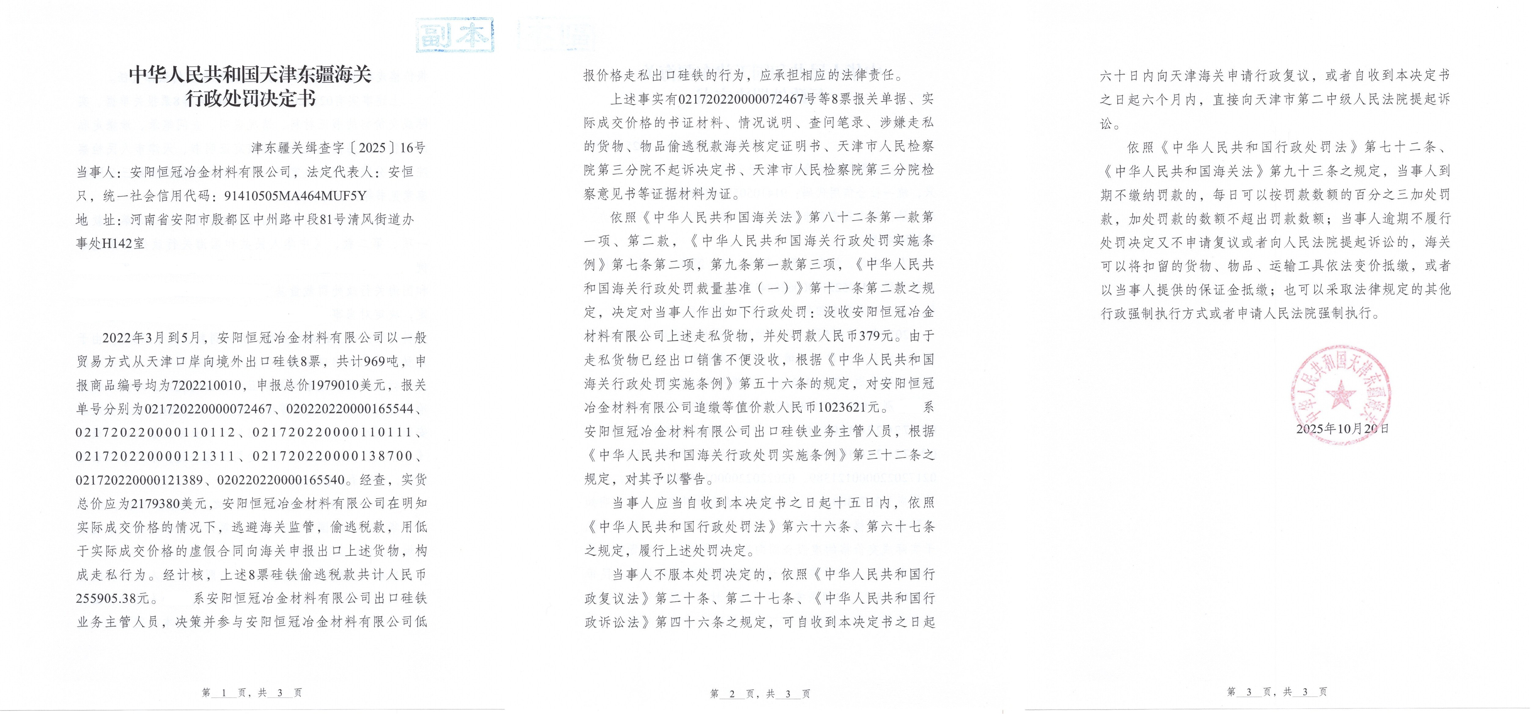 中华人民共和国天津东疆海关关于安阳恒冠冶金材料有限公司的行政处罚决定书(津东疆关缉查字〔2025〕16号).xls
